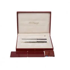 S.T. Dupont brings you this lovely set of one ballpoint pen and one fountain pen. They have been made from silver-tone metal and designed with textures. They have pocket clips and signature engravings. The pens are marked by quality craftsmanship and technical precision.